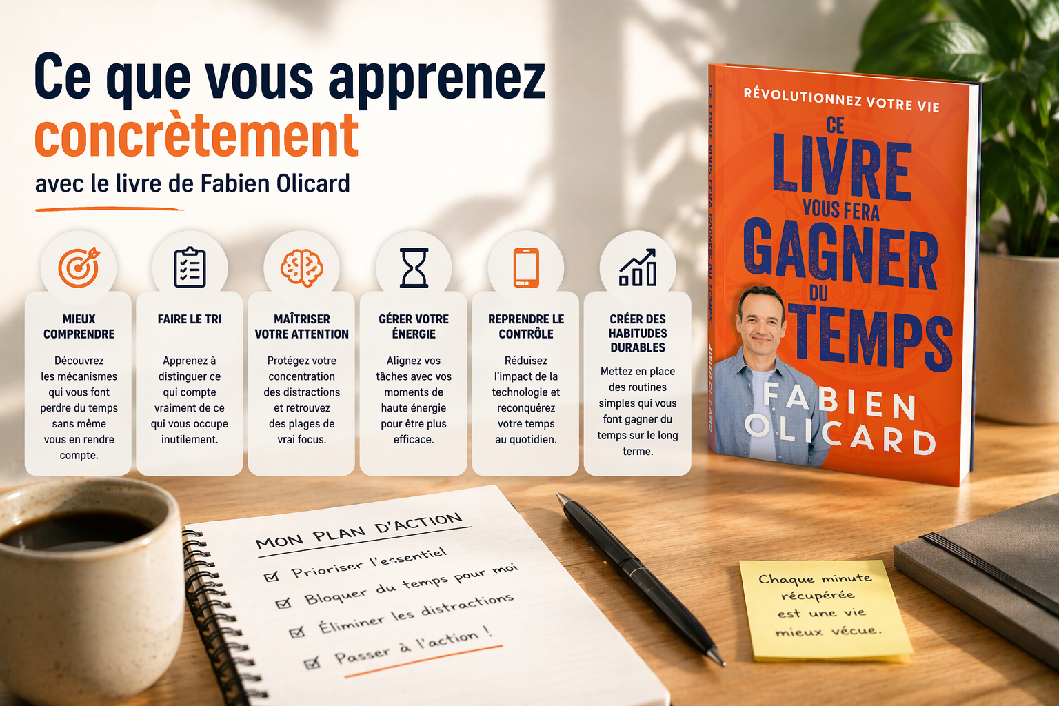 Ce livre vous fera gagner du temps est un ouvrage de Fabien Olicard consacré à notre rapport au temps, à la gestion du quotidien et aux mécanismes qui donnent l’impression que les journées nous échappent. Le livre se place dans la continuité de son travail autour de la compréhension des habitudes mentales et de la manière dont nous vivons notre organisation personnelle. Il ne s’agit pas seulement d’un guide pratique pour caser plus de choses dans un agenda. L’ambition semble plus large : aider le lecteur à reprendre la main sur son temps de façon plus lucide et plus durable.