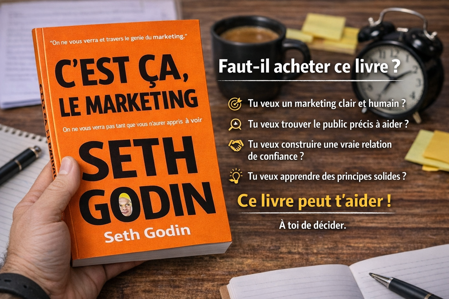 Oui, C’est ça le marketing de Seth Godin vaut l’achat dans beaucoup de cas, mais pas pour tout le monde. Ce livre n’est pas un manuel d’outils, c’est une boussole. Il t’aide à prendre de meilleures décisions marketing, ce qui a souvent plus de valeur qu’une énième technique à la mode. La vraie question n’est donc pas “est ce que le livre est bon”, mais “est ce que c’est le bon livre pour toi maintenant”.