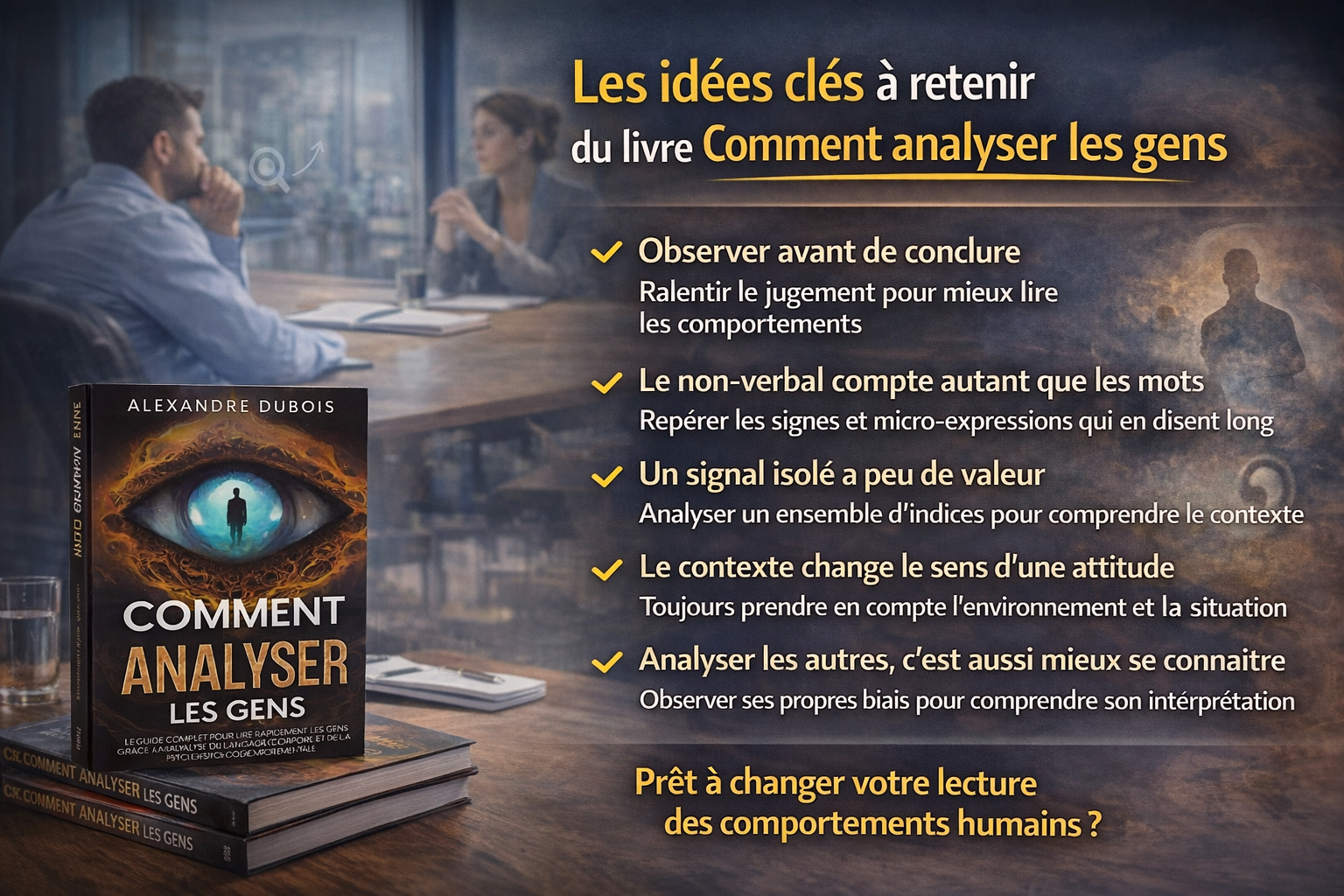 S’il fallait résumer Comment analyser les gens en quelques idées fortes, on pourrait dire que le livre tourne autour d’un principe simple : pour mieux comprendre les autres, il faut apprendre à regarder au-delà des mots. Et ce n’est pas si évident, parce qu’on a tendance à aller trop vite.