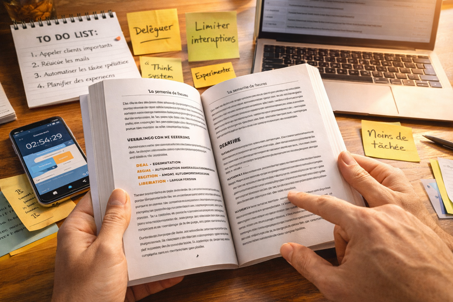 L’auteur s’appuie sur une méthode devenue célèbre : la méthode DEAL, pour Definition, Elimination, Automation, Liberation. En français, on peut la résumer ainsi : redéfinir ses objectifs, éliminer le superflu, automatiser ce qui peut l’être, puis se libérer d’un mode de travail trop rigide. Ce cadre donne au livre une structure claire et concrète, ce qui explique en partie son succès.