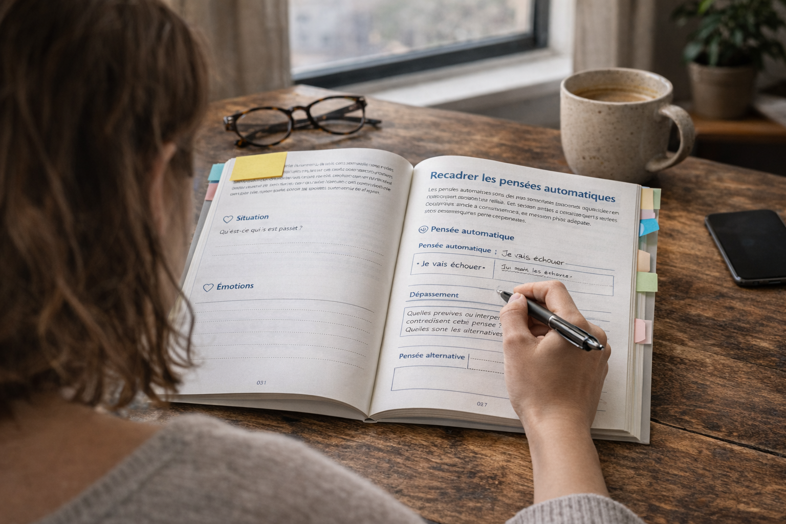 D’abord, tu apprends à repérer tes pensées automatiques. Ce sont ces phrases rapides qui surgissent sans prévenir et qui te donnent l’impression d’être vraies. Je vais me ridiculiser. Je ne vais pas y arriver. C’est de ma faute. On va me juger. Le livre t’entraîne à les identifier au bon moment, à les écrire, puis à voir l’effet immédiat qu’elles produisent sur ton émotion et sur ton corps. Rien que cette prise de recul change déjà ton rapport à ce qui se passe dans ta tête.