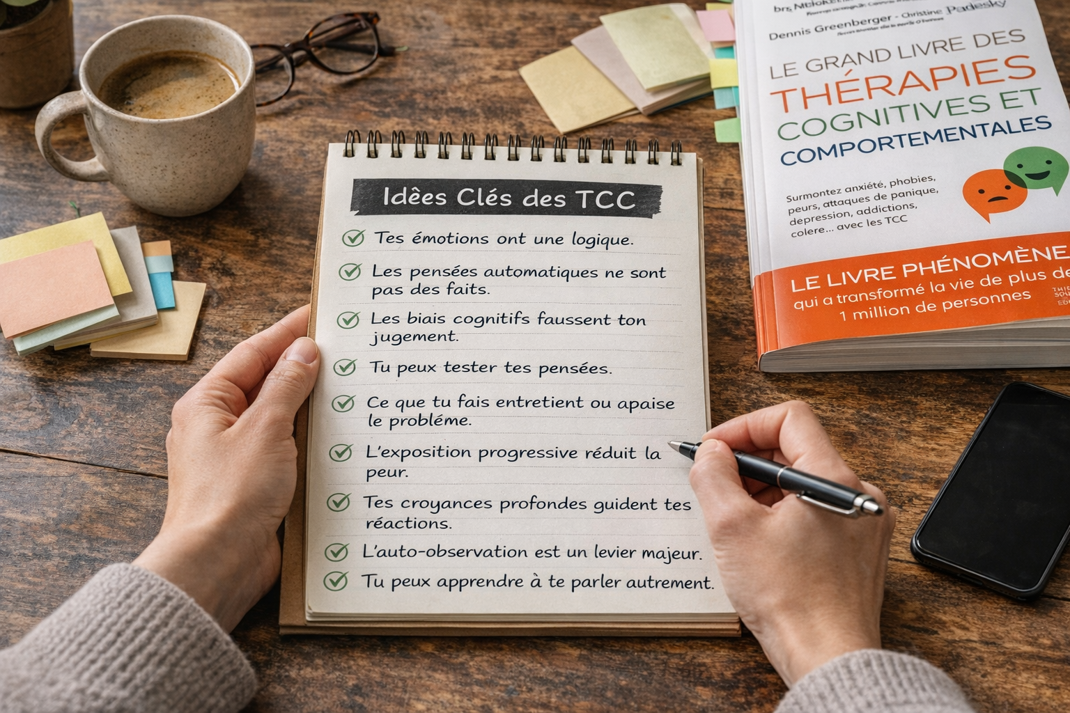 Les idées clés des TCC tournent autour d’un principe simple : tu ne peux pas empêcher toutes les pensées ou toutes les émotions d’apparaître, mais tu peux apprendre à modifier ce qui les alimente et ce que tu fais ensuite. Le grand livre des thérapies cognitives et comportementales rassemble ces concepts en une logique claire, pratique et répétable. Voici les points essentiels à retenir.