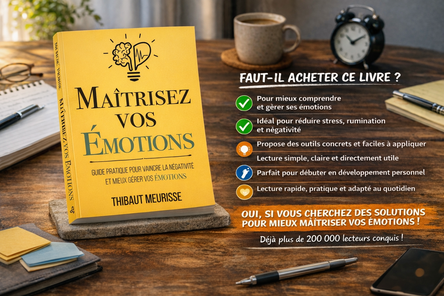 Oui, si vous cherchez un livre pratique, accessible et directement utile pour mieux gérer vos émotions au quotidien. C’est sans doute là que Maîtrisez vos émotions semble le plus convaincant. Le livre promet un cadre simple pour comprendre les émotions, réduire la négativité et développer plus de stabilité intérieure. Pour beaucoup de lecteurs, c’est exactement ce qu’ils attendent d’un ouvrage de développement personnel : moins de théorie inutile, plus d’outils concrets.