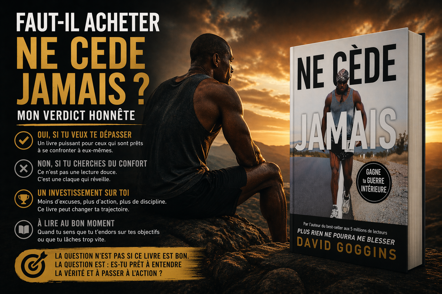 Oui, Ne cède jamais mérite d’être acheté si tu cherches un livre capable de te challenger en profondeur. Ce n’est pas un achat à faire pour “consommer” un livre de plus sur le dépassement de soi. C’est un livre à acheter si tu es prêt à te confronter à toi-même, à revoir ton niveau d’exigence et à accepter une lecture qui ne cherche pas à te ménager. Dans ce cadre-là, l’investissement a du sens.
