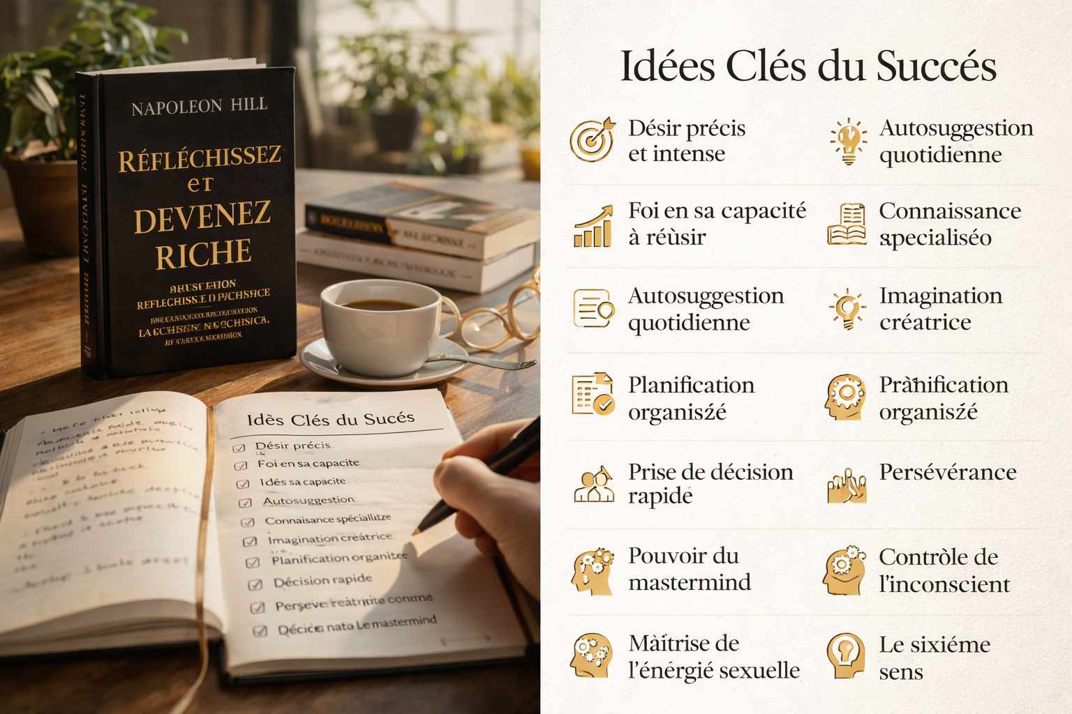 Le livre repose sur un ensemble de principes fondamentaux qui structurent toute la philosophie de la réussite selon Napoleon Hill. Ces idées clés forment un cadre mental cohérent que l’on peut appliquer dans tous les domaines liés à l’argent, au travail et aux projets personnels.