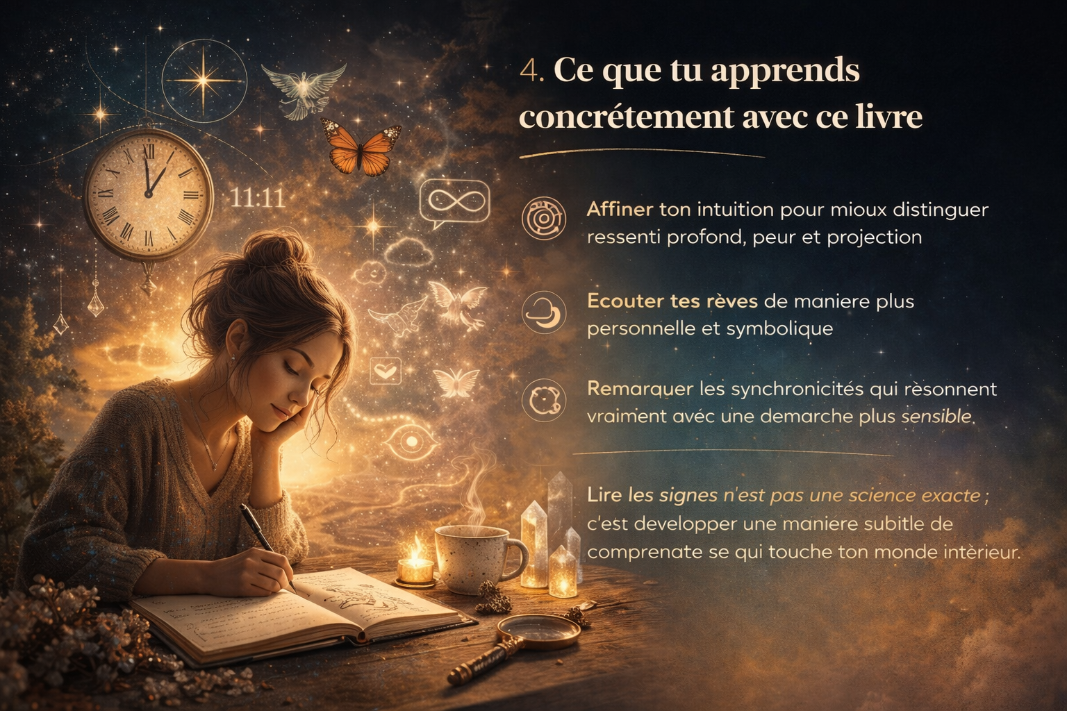 Le livre peut également t’aider à poser un autre regard sur les synchronicités. Au lieu de courir après les “signes”, tu apprends à remarquer ce qui te touche vraiment, ce qui résonne profondément, ce qui se répète avec cohérence. Cette posture est plus mature et plus saine.