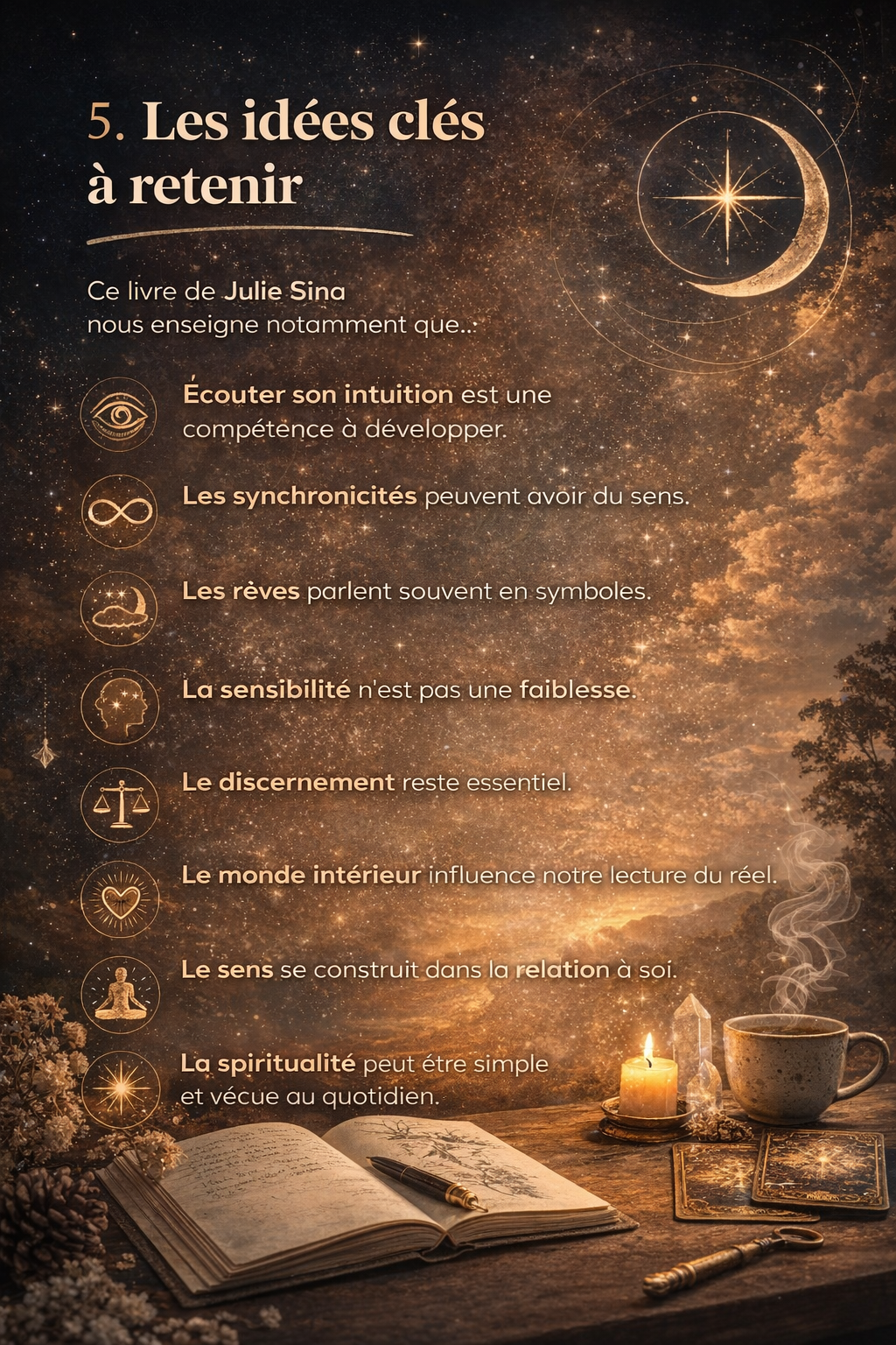 Voici les grandes idées que l’on peut retenir d’un livre comme « Signes, Synchronicités et Rêves » de Julie Sina, surtout si l’on cherche à en saisir l’essentiel rapidement. Ces idées forment la colonne vertébrale du message global du livre.